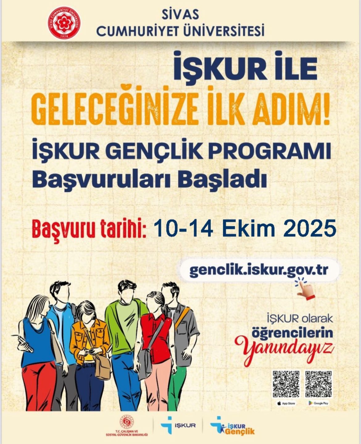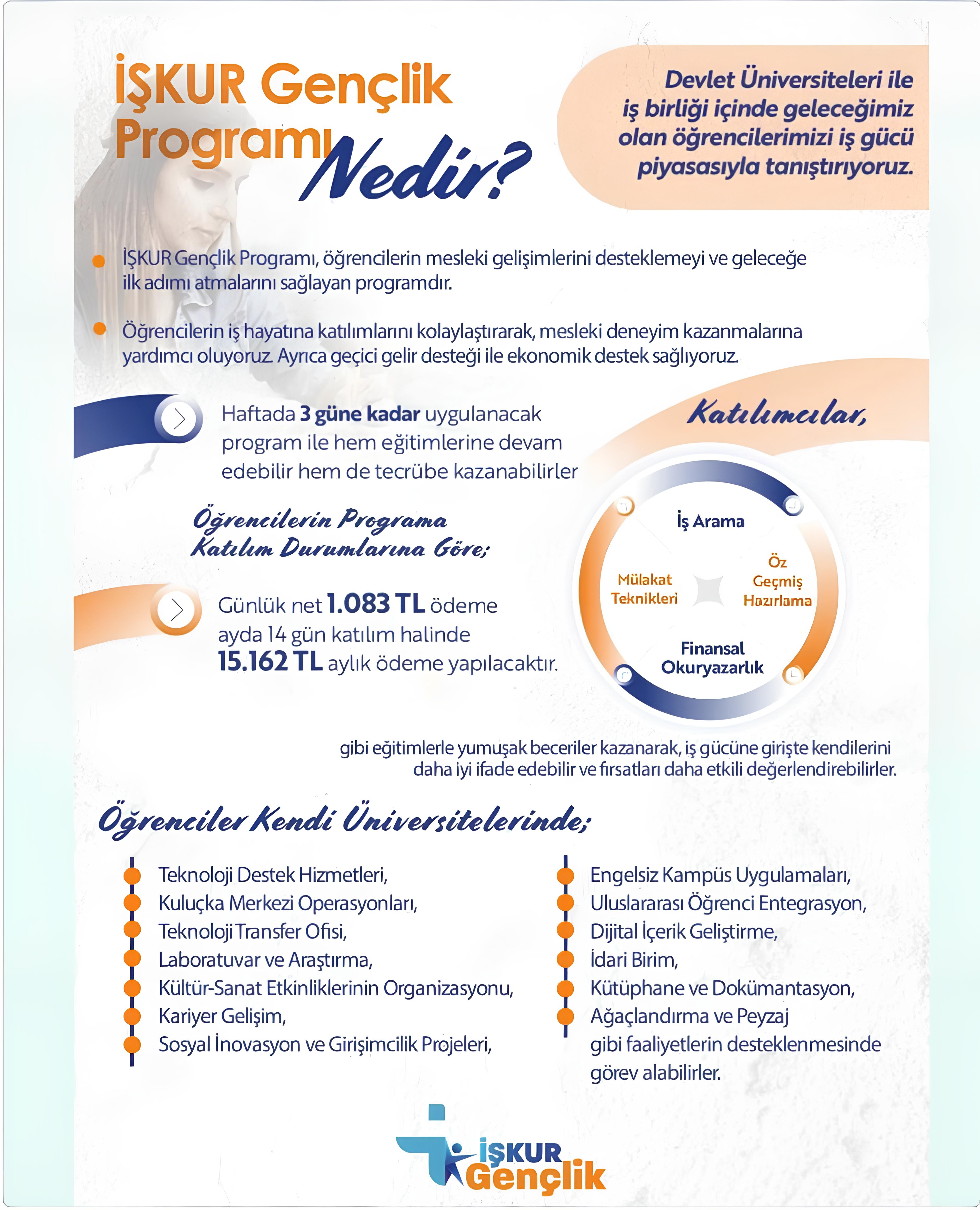 Üniversitemiz ve İŞKUR Sivas İl Müdürlüğü işbirliğinde Kariyer Planlama Uygulama ve Araştırma Merkezi koordinesinde İŞKUR Gençlik Programı düzenlenecektir. İŞKUR Gençlik Programı, gençlerin mesleki deneyim kazanmalarını, iş hayatına adım atmalarını ve geçici gelir desteğiyle ekonomik olarak desteklenmelerini sağlamayı amaçlamaktadır.