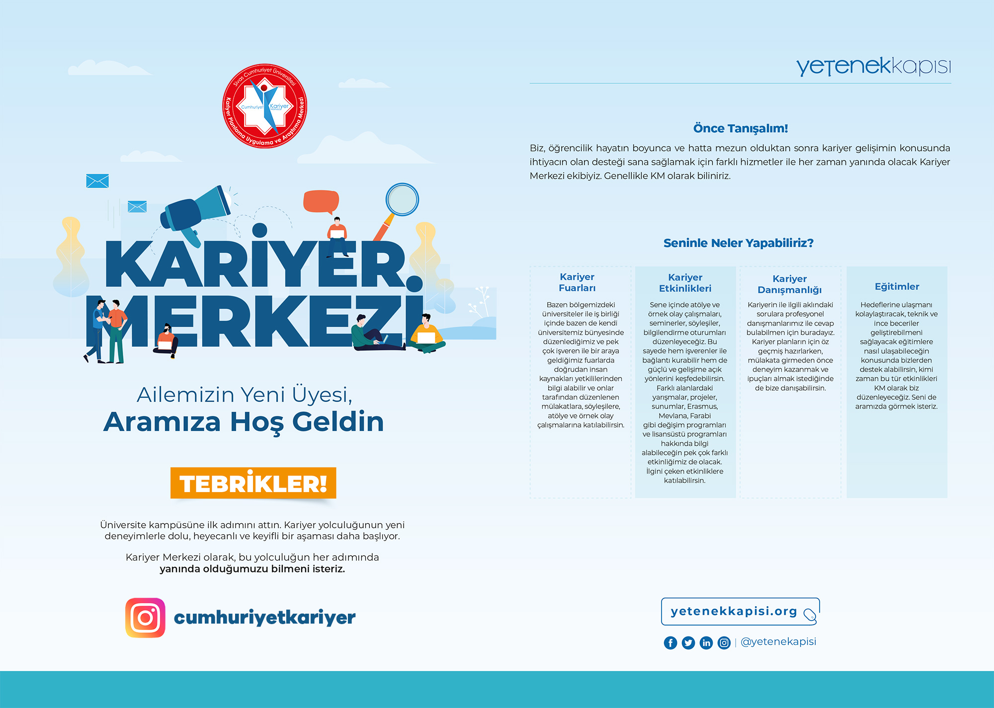 Cumhurbaşkanlığı İnsan Kaynakları Ofisi tarafından geliştirilen“Yetenek Kapısı” portalı; öğrencilere iş ve staj ilanları, kariyer etkinlikleri, kariyer fuarları,danışmanlık hizmetleri ve çeşitli duyurulara kolayca ulaşabilme imkânı sunmaktadır. Üniversitemize bu yıl yeni başlayan tüm öğrencilerin ve öğrenimine devam edip henüz Yetenek Kapısı’ na kayıt olmamış öğrencilerin Yetenek Kapısı portalına üye olmaları gerekmektedir.